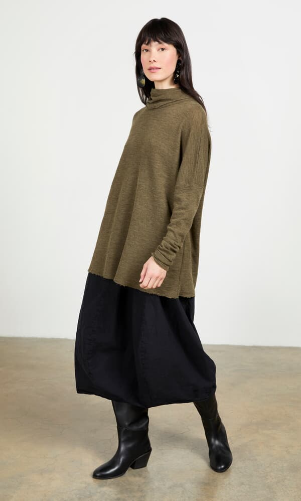 Marled wool roll neck in a fine and stretchy merino knit. Long relaxed shape offset with dropped shoulders and narrow sleeves. Edges are left deliberately raw and unfinished. L67cm.